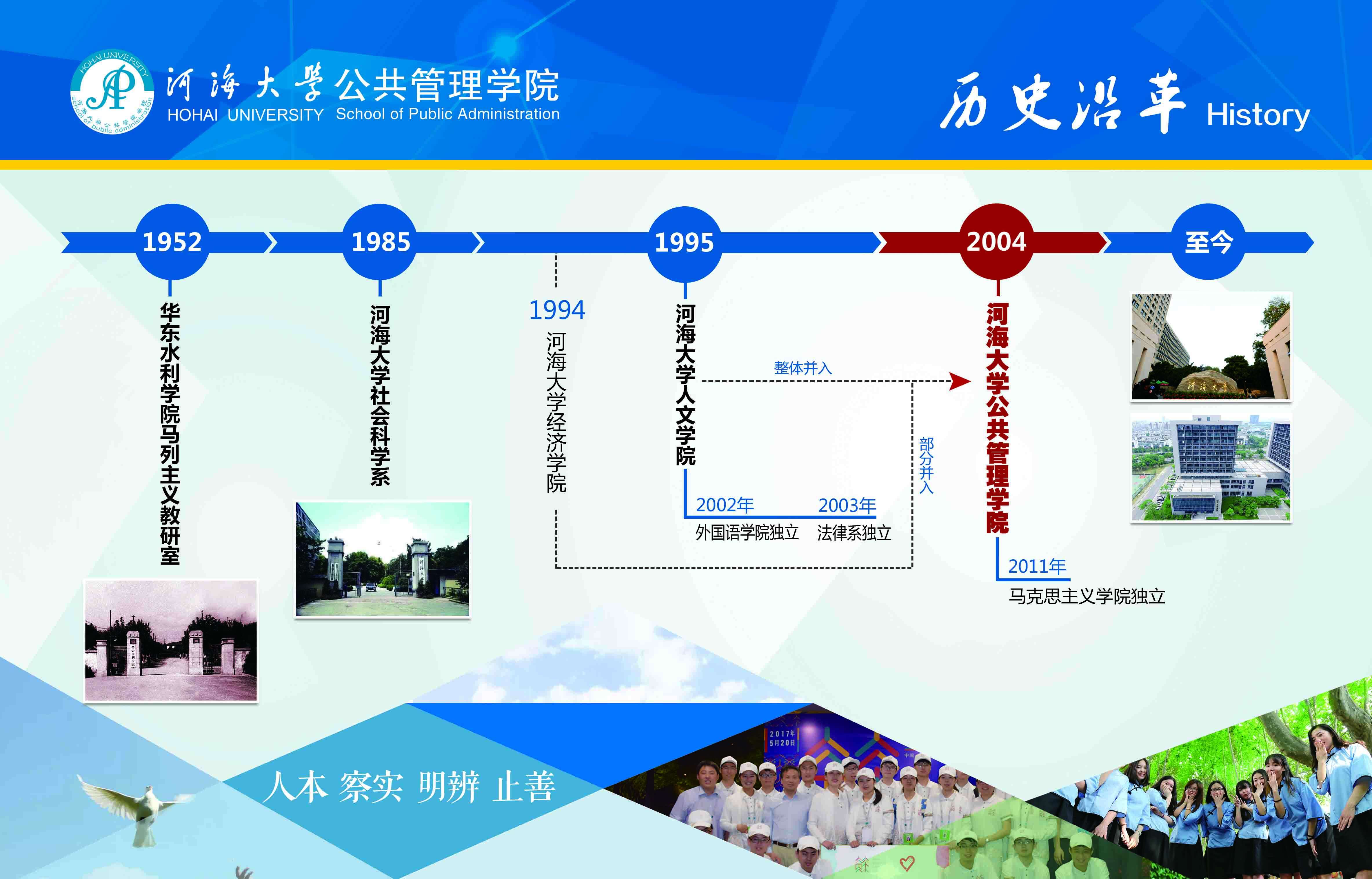 永利集团3044欢迎光临的前身可追溯到1952年成立的华东水利学院马列主义教研室。1985年,成立了社会科学系。1992年根据经济和社会发展的形势和需要,成立了水利部移民研究中心。1995年,以社会科学系和外语系为基础,成立人文学院。2002年,外语系从人文学院中分出,单独成立外国语学院。2004年,人文学院(法律系行政独立)与移民研究中心整合为永利集团3044欢迎光临。2011年,哲学系和政治学系从永利集团3044欢迎光临分出,单独成立马克思主义学院。