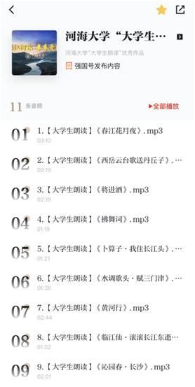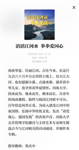 本次音频集录制在校宣传部的支持和学院党委的指导下,将师生党史学习教育与学校“水文化”特色充分结合,由新闻传播学系师生从浩瀚灿烂的“江河”主题诗词中精选出十余部优秀经典作品作为朗诵文本,历经筹备、选拔、指导和录制等多环节。精心制播的朗诵音频作品不仅通过语言艺术展现了永利集团3044欢迎光临“上善若水,笃学敦行”文化形象和“我饮河海一滴水,我献祖国一生情”的河海精神,也旨在向全社会传播中华悠久历史中独具特色的水文化,受到了社会各方的好评。