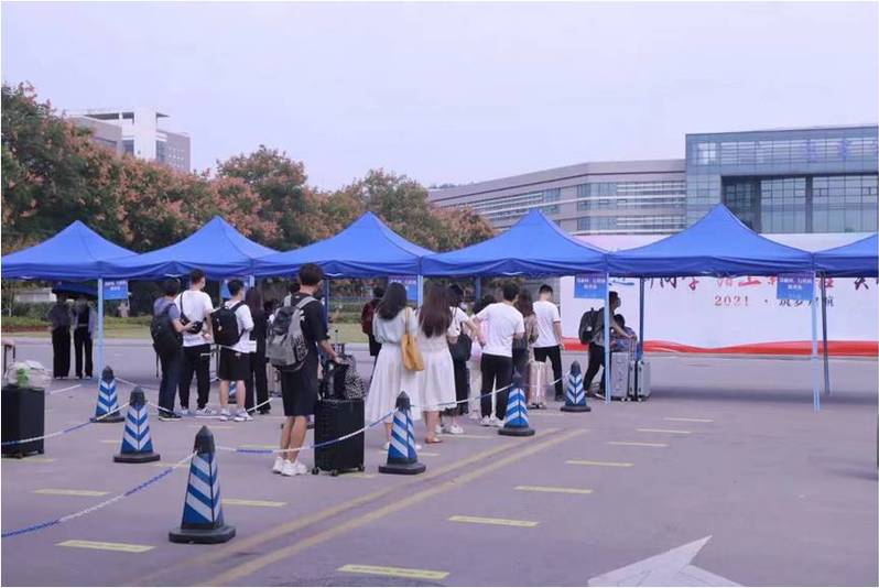 学校南门设置了专为新生搭建的引导站,迎新志愿者们已经早早在此等候,为初到校园的新生提供全力帮助。进入校园,新生可以选择乘坐接驳大巴,或在志愿者的指引下自行前往宿舍,填写入住信息,领取钥匙,然后在厚学楼一楼完成入学相关手续。