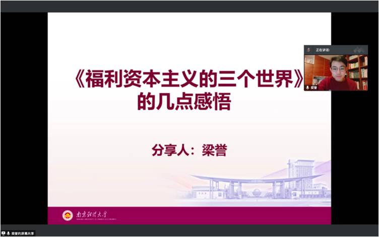 2021年11月15日晚,公管院社会保障系读书报告会采用腾讯会议的方式顺利进行。本期报告会有幸请到南京财经大学梁誉副教授开展主题为《福利资本主义的三个世界》读书分享讲座。报告会由永利集团3044欢迎光临社会保障系郭剑平、陈际华两位副教授主持,参会者包括永利集团3044欢迎光临社会保障系研究生及本科生。