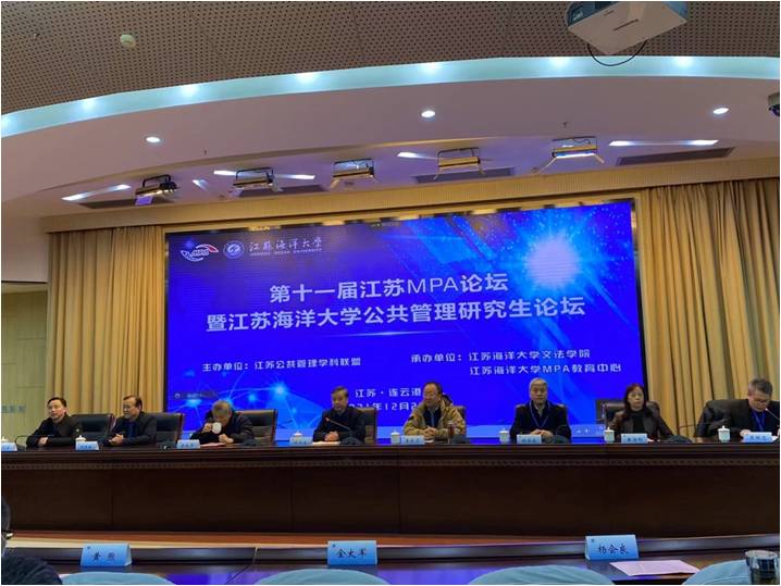 12月26日,由江苏MPA论坛组委会主办,江苏海洋大学文法学院、MPA教育中心承办的第十一届江苏MPA论坛暨“江苏海洋大学公共管理研究生论坛”在江苏海洋大学顺利召开。全国 MPA 教指委秘书长杨开峰教授,全国MPA教指委委员李俊清教授、孙涛教授、麻宝斌教授、孙萍教授、章文光教授、颜佳华教授,全国MPA教指委秘书处办公室主任谢佳宏等领导和专家应邀出席。来自省内20个MPA培养院校的永利集团3044欢迎光临院长、师生代表等100多人参加大会。永利集团3044欢迎光临院长黄涛珍教授、MPA中心副主任范仓海副教授,以及MPA同学等6人参加了会议。