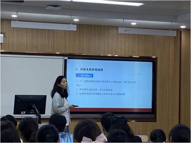 随后,黄晓华从养老服务责任分担等社会热点问题出发,介绍了养老保险政策演变和总体框架设计,分析了机关事业单位基本养老保险制度发展历程,提出机关事业单位基本养老保险制度改革背景和改革内容,结合具体案例讲解了改革后养老保险缴费和关系转移接续等具体政策内容。此外,黄晓华还介绍了机关事业单位职业年金制度和实施状况。在师生互动环节,黄晓华针对同学们关心的机关事业单位养老保险实施存在问题和解决思路、机关事业单位基本养老保险管理职责划分,以及职业年金发展现状和趋势等进行了现场解答,并结合实践,给出了职业生涯规划等具体建议。