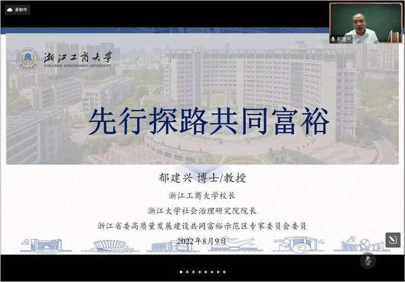 8月9日上午,江苏省研究生“新时代高质量发展与公共治理转型”暑期学校第六场课程“先行探路共同富裕”顺利开课。课程主讲人为浙江工商大学校长郁建兴教授。主持人为永利集团3044欢迎光临客座教授童星,来自海内外50余所高校的100名学员以及公共管理学院师生参加。授课开始前,童星教授对郁建兴教授出席暑期学校表示热烈欢迎,并向暑期学校师生介绍了郁建兴教授的研究领域及丰硕成果。