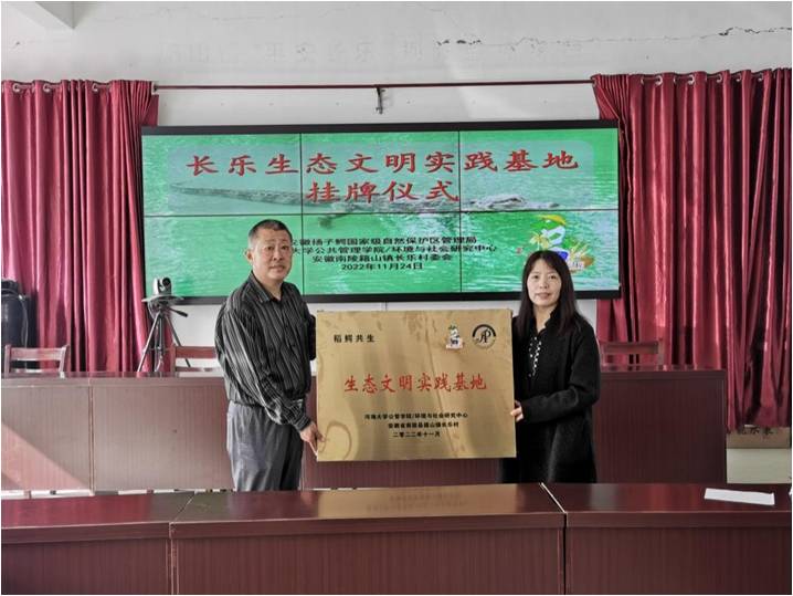 为进一步深化校地合作,助力乡村振兴,推进生态文明建设,2022年11月24日上午,“长乐生态文明实践基地”挂牌仪式在安徽省南陵县籍山镇长乐村顺利举行。永利集团3044欢迎光临党委副书记朱志梅教授、副院长陈涛教授、社会学系主任顾金土教授出席了挂牌仪式,芜湖市委政法委三级调研员、籍山镇长乐村党委第一书记、驻村工作队队长邢毅,安徽扬子鳄国家级自然保护区管理局南陵保护站站长涂根军等班子成员参加仪式。南陵县乡村振兴局党组成员、副局长管健应邀出席挂牌仪式。