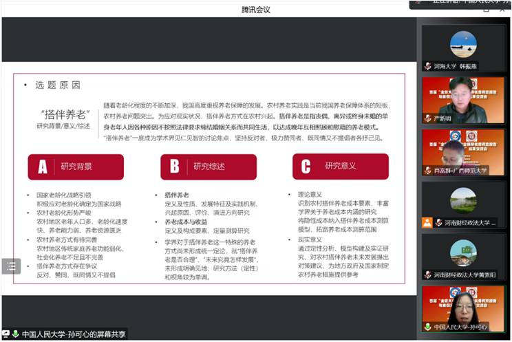 永利集团官网韩振燕教授指导、劳动与社会保障专业2022届本科毕业生(现在中国人民大学老年学专业攻读硕士研究生)孙可心同学撰写的《农村搭伴养老方式存适价值调查报告——以河北省张北县S村为例》被评为“优秀调查报告”并在大会上分享交流。孙可心同学的调查报告聚焦于“农村搭伴养老”,通过实地调研获取一手资料,基于扎根理论分析识别搭伴养老的成本收益并进行测算模型的建构,最终得出农村搭伴养老具有经济合理性,并提出促进其良性发展的对策建议。广西师范大学肖富群教授肯定了孙可心同学扎实的理论基础和实践能力,并且认为选题体现出了强烈的社会责任感和人文价值关怀,肖教授特别提出,孙可心同学能够运用扎根理论进行模型构建对访谈资料进行处理的方法值得肯定。
