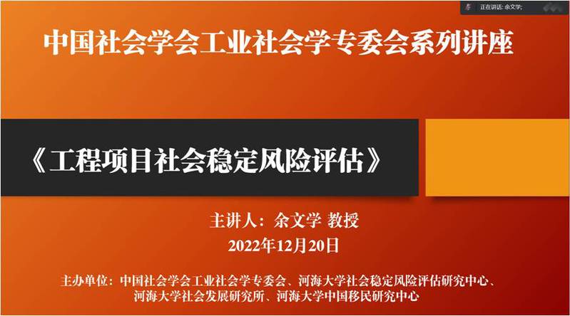 2022年12月20日,“中国社会学会工业社会学专业委员会系列”系列报告暨河海公管大讲堂以腾讯会议的形式举行。工业社会学专业委员会第三届副理事长、永利集团3044欢迎光临余文学教授应邀作了题为“工程项目社会稳定风险评估”的学术报告。