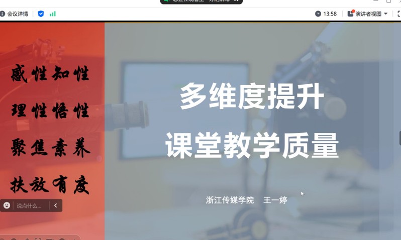 王一婷教授是《播音主持创作基础》国家一流课程负责人,也曾获首届高校教学创新大赛一等奖,浙江省高校青年教师教学竞赛特等奖,被评为浙江省我最喜爱的高校优秀思政课教师,浙江省首批网络教育名师,有着丰富的教学经验。在报告会中,王一婷教授围绕多维度提升课堂教学质量的方法层层展开内容分享,教学设计的路径、课程思政的元素、课堂感染力的表达,不仅有理论,还有丰富的案例,可操作性的指导。