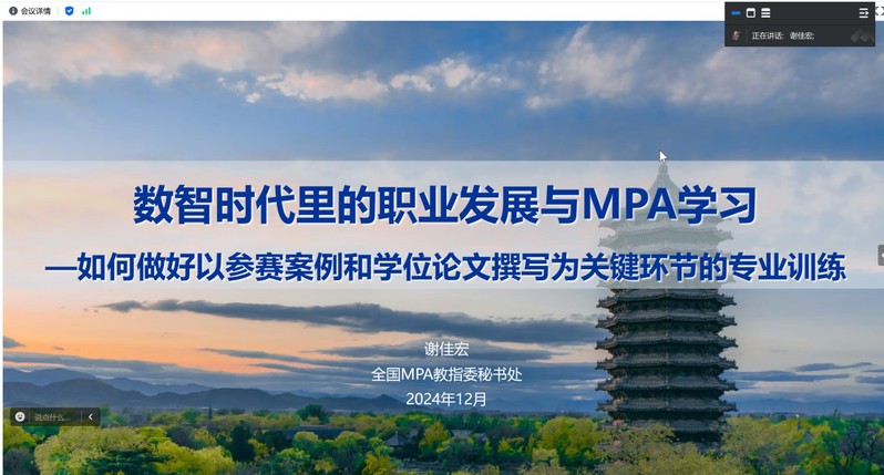 谢主任围绕“数智时代里的职业发展与MPA学习”这一主题。首先阐述了AI赋能下的新人类的变与不变,他明确指出,在人工智能高速发展的今天,职场中的能力差异、成效差异以及职业发展路径的差异将被进一步放大。谢主任强调,面对未来,我们必须提升批判性思维、创新意识以及沟通与合作的能力。接着,谢主任简要回顾了我国MPA教育的办学成就,随后深入剖析了影响职业成功的因素。最后针对MPA研究生的发展,他强调参加案例大赛、写好学位论文是读好MPA的核心要求,并从选题、结构、理论、分析、文本以及剖析六个方面分析了中国研究生公共管理案例大赛获奖因素。