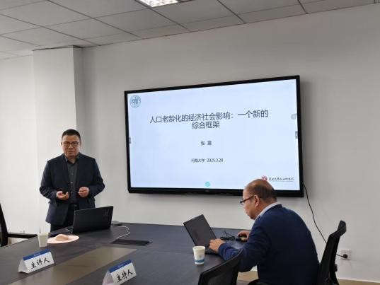 2025年3月28日上午,河海社会学论坛第二百二十五期于厚学楼909会议室如期举行。复旦大学人口研究所所长、人口发展与公共政策研究中心副主任张震教授受邀为永利集团官网师生做题为“人口老龄化的社会经济影响:一个新的综合框架”的学术报告。报告会由永利集团官网人口研究所王欢老师主持,黄健元老师、王毅杰老师、石德生老师、秦贤宏老师、闫东升老师、张丹老师以及众多博/硕士生参加了报告会。